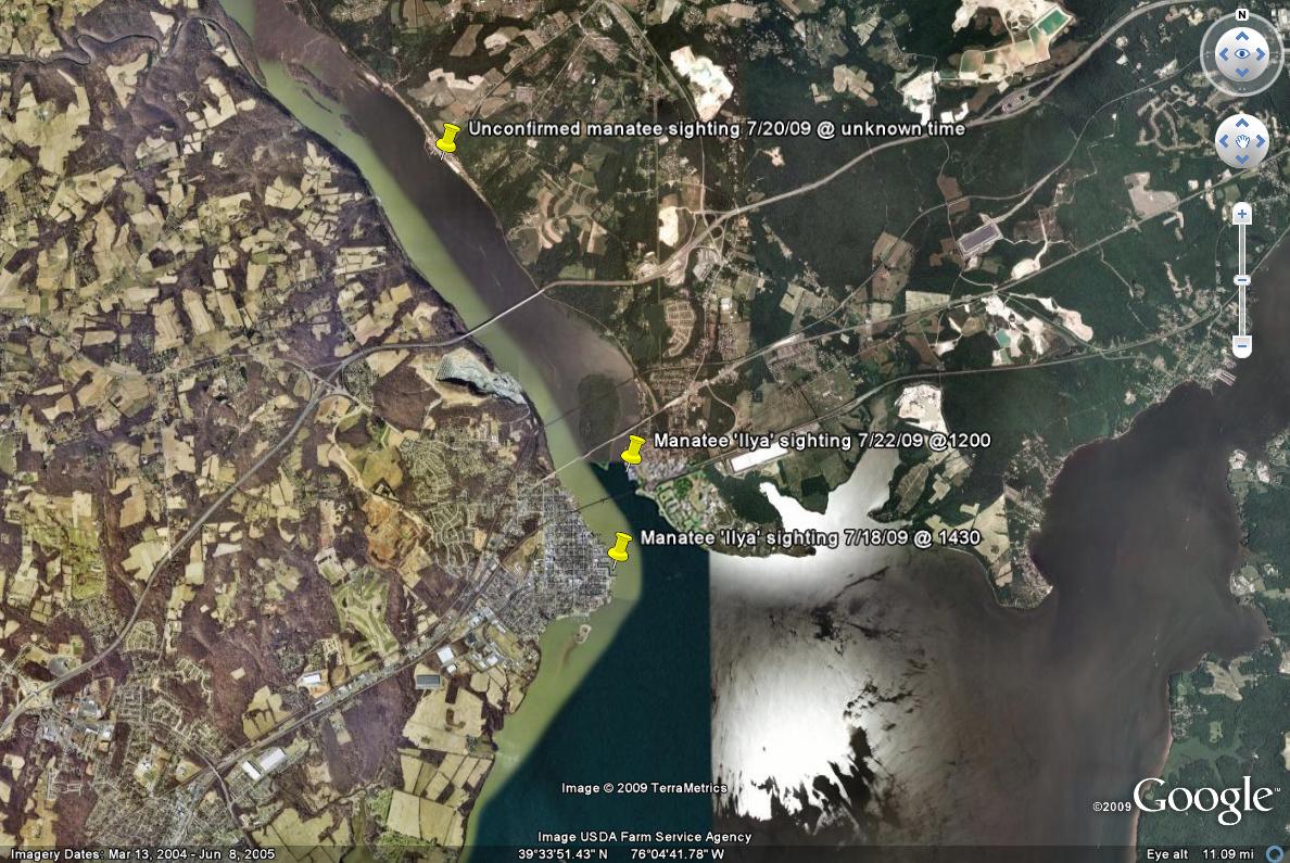 The National Aquarium has confirmed another sighting of manatee “Ilya”, reported yesterday in Perryville by Town Commissioner Gary Tennis. The animals appears to be moving freely between the top of the Bay and the Susquehanna River.